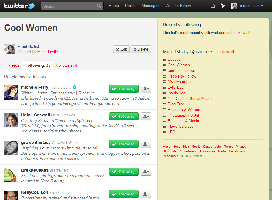 Sort who you follows by industry, by location, by relationship, by activity level. There are as many ways to use Twitter lists as there are people who use them.